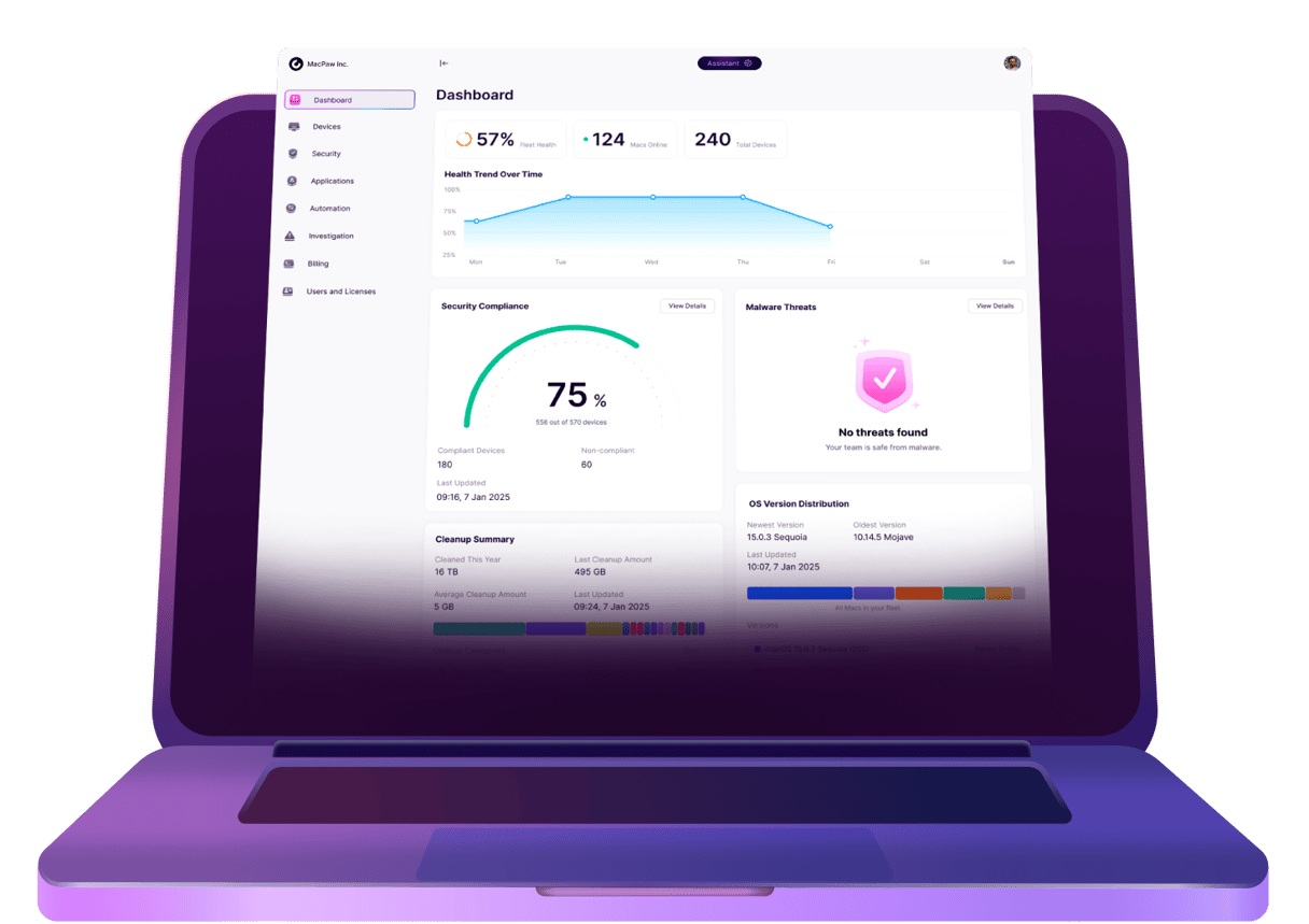 One of the key features of any enterprise management system is the ability to deploy devices to new starters or new devices to existing employees remotely without any intervention from support staff. This is known as ‘zero-touch’ deployment. Apple Enterprise Management is designed to provide that. When a device is sent out to a user, they open the box, connect it to the internet, and follow the instructions on the screen. Everything else is automated, and any software not already installed can be downloaded via a self-service app preinstalled on the Mac. Once the device is connected to the company VPN, systems support staff are able to monitor it on the network.