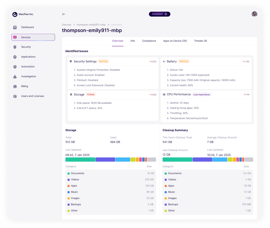 Paired with platforms like Jamf or Kandji, CleanMyMac Business adds anti-malware, drive cleaning, and performance optimization features that benefit larger enterprises.