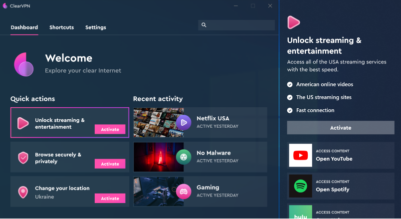 ClearVPN’s DynamicFlow technology automatically analyzes your network and connects you to the fastest idle server. You get secure, low-ping, and smooth access based on their activity or goal.