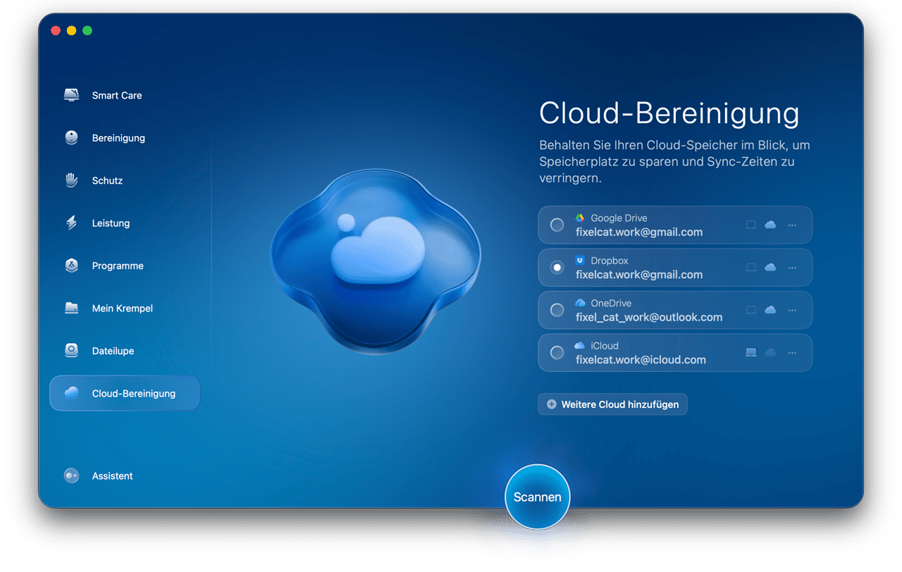 Stellen Sie überall Ordnung her – auf Ihrem Mac und in Ihrer Cloud. Finden Sie große Dateien, die den meisten Cloud-Speicher belegen, und doppelte lokale Kopien, die Ihren Mac überladen.