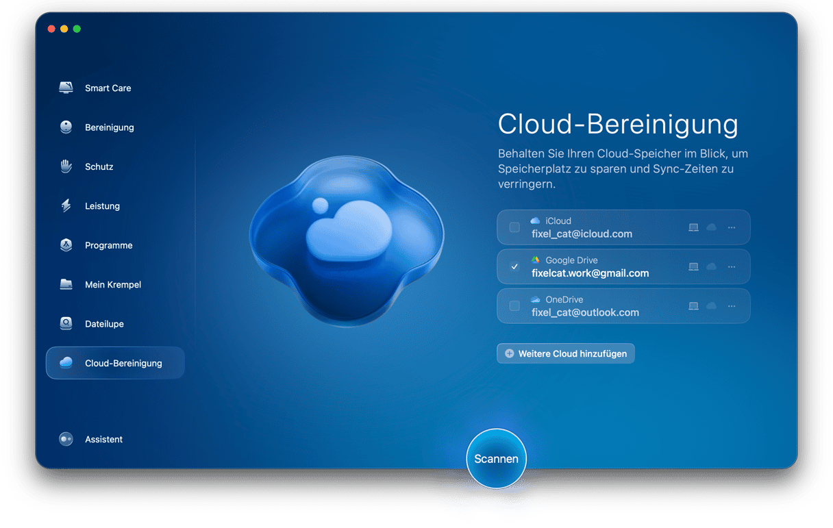 - Klicken Sie in der Seitenleiste auf „Bereinigung“ und verbinden Sie das Cloud-Speicherkonto, das Sie überprüfen möchten.