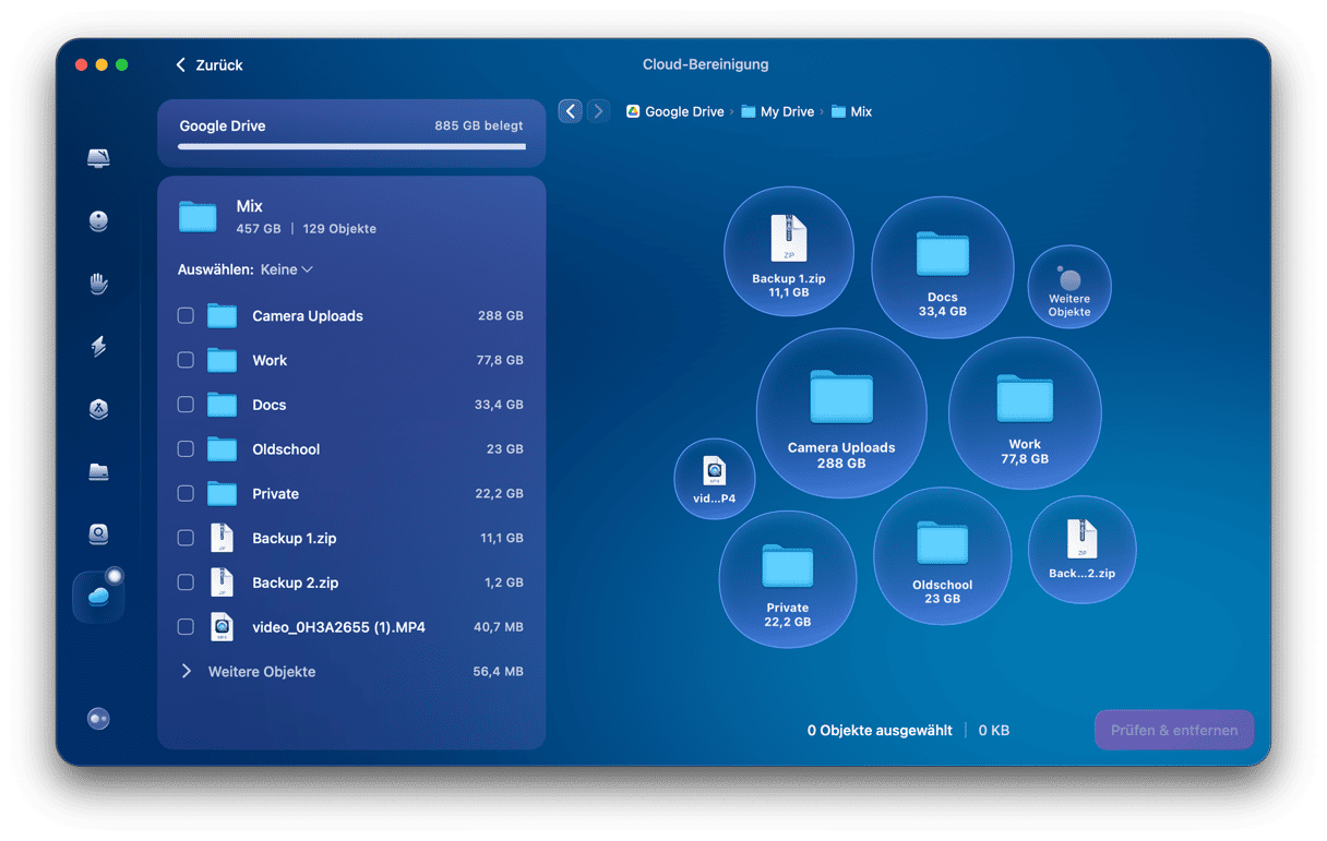Um noch einen Schritt weiterzugehen, probieren Sie die Cloud-Bereinigung in CleanMyMac aus. Die Software verbindet sich mit Ihren Cloud-Konten und bietet Ihnen eine übersichtliche, kachelbasierte Ansicht Ihrer gespeicherten Dateien. So sehen Sie auf einen Blick, welche Dateien lokal synchronisiert sind und welche sich nur in der Cloud befinden. Auf diese Weise können Sie intelligentere Speicherentscheidungen treffen. So gehen Sie Schritt für Schritt vor: