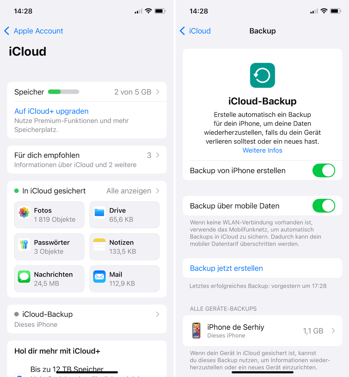 Wenn der Schalter auf Grün steht, dann erstellt Ihr iPhone eine Sicherungskopie in iCloud. Sie sehen dann auch, wann das letzte Backup durchgeführt wurde. Falls das iCloud-Backup nicht aktiviert ist, dann legen Sie den Schalter um und tippen Sie auf „Backup jetzt erstellen“.