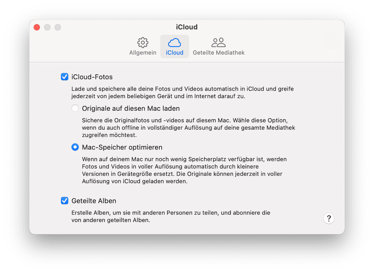 Nutzen Sie die Fotos-App zum Speichern und Verwalten Ihrer Bilder? Dann können Sie den Speicherplatzbedarf reduzieren, indem Sie nur Versionen mit niedriger Auflösung auf Ihrem Mac speichern und die Originale mit voller Auflösung in iCloud aufbewahren. Wenn Sie ein Foto bearbeiten oder teilen möchten, dann können Sie die Originalversion einfach herunterladen.