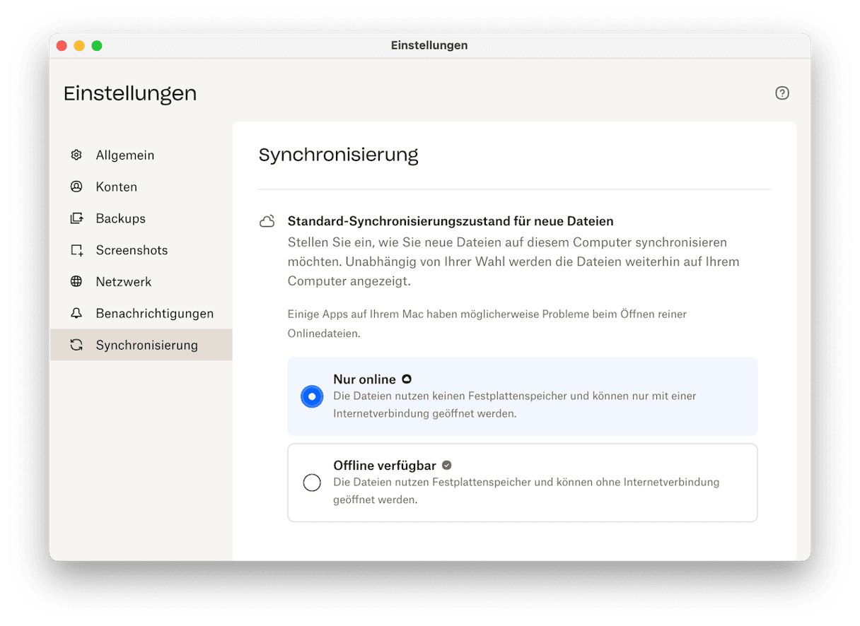 Mit dieser Funktion können Sie alle Ihre Dateien in Dropbox anzeigen, ohne Speicherplatz auf Ihrem Mac zu belegen, da Ihre Dateien ausschließlich online gespeichert werden.