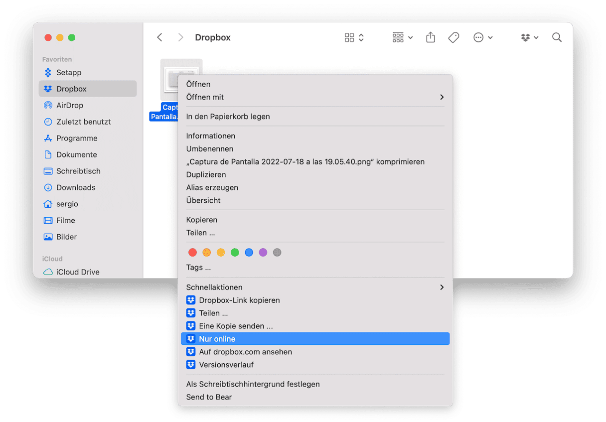Ja. Viele Nutzer denken, dass Sie durch das Speichern von Dateien in Dropbox Speicherplatz auf ihrem Computer sparen. Aber das ist nicht der Fall. Jede Datei in Ihrem Dropbox-Konto wird auf Ihrer Festplatte oder SSD gespiegelt, d. h. die Datei wird sowohl auf Ihrem Mac als auch in der Cloud gespeichert. Wenn Sie also 2 GB an Dateien in Dropbox gespeichert haben, belegen diese Dateien auch 2 GB Speicherplazt auf Ihrem Mac.