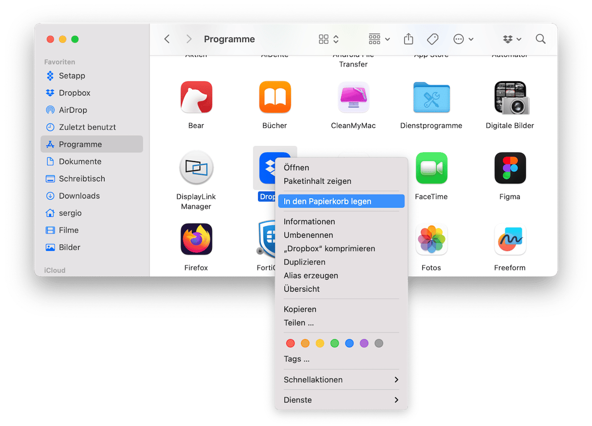 - Wechseln Sie anschließend in den Ordner „Programme“ und ziehen Sie die Dropbox-App in den Papierkorb.
