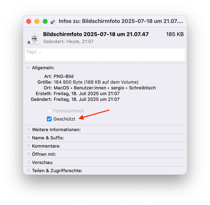 Die Option zum Sperren von Dateien auf dem Mac finden Sie im Menü „Informationen“, wenn Sie bei gedrückter Strg-Taste auf eine beliebige Datei klicken.