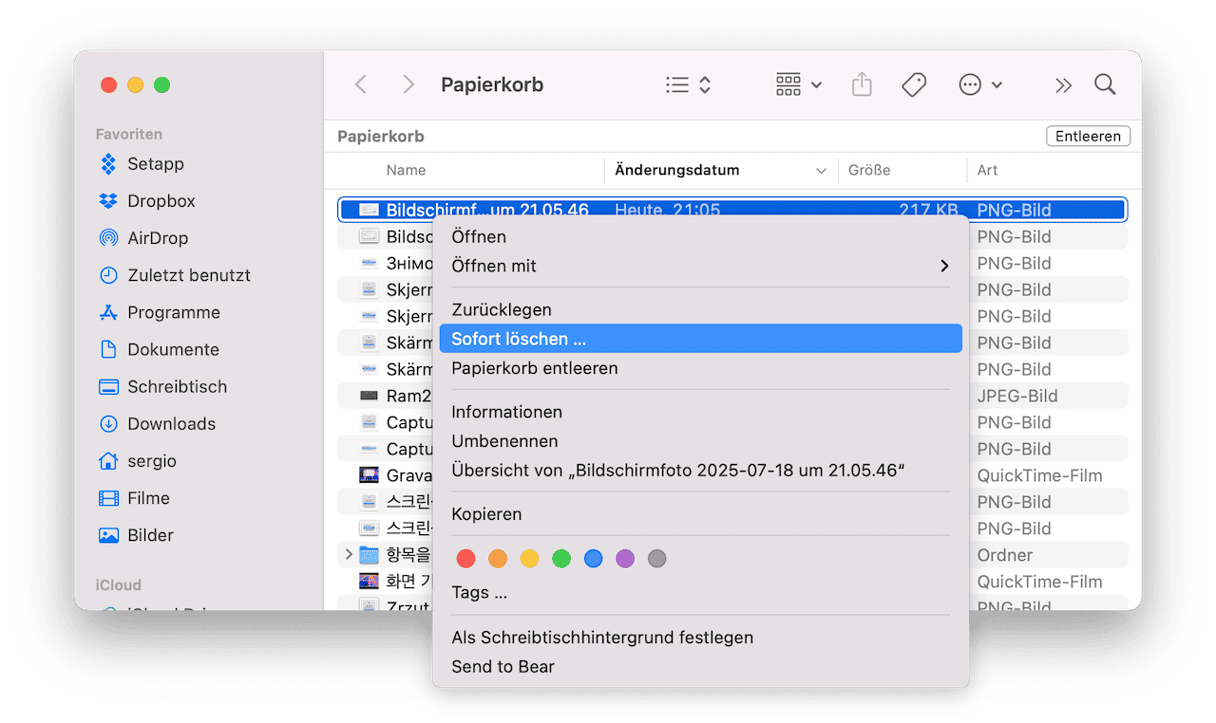 Achtung: Es gibt keinen Weg zurück! Verwenden Sie Command + Option + Delete, wenn Sie eine Datei vollständig entfernen möchten. Sie wird nicht in den Papierkorb verschoben und Sie können sie später nicht wiederherstellen.
