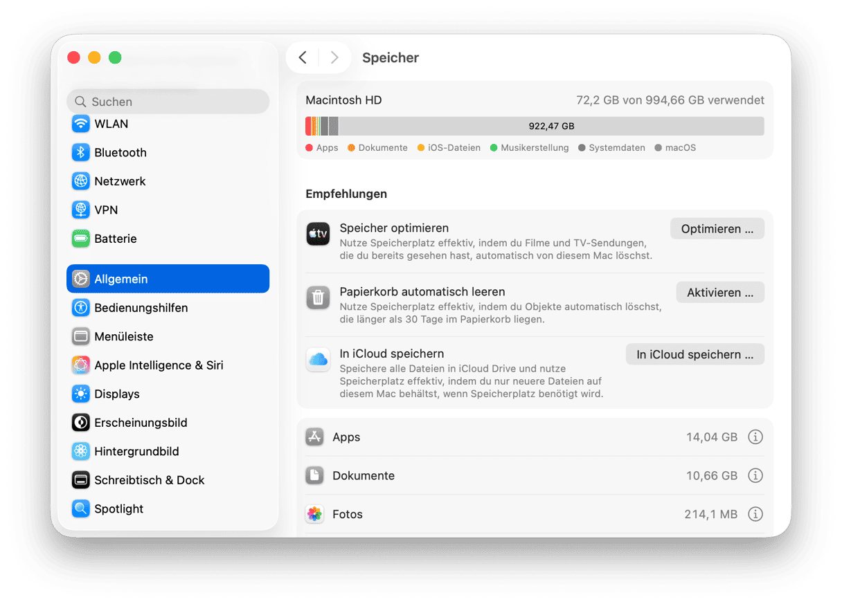 - Wählen Sie „Über diesen Mac“ > „Weitere Infos“ > „Speichereinstellungen“.