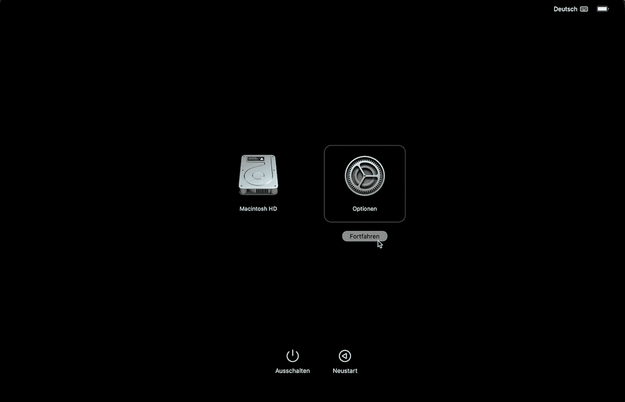 - Drücken Sie kurz die Ein-/Ausschalttaste und halten Sie dann die Tastenkombination „Befehlstaste + R“ gedrückt.