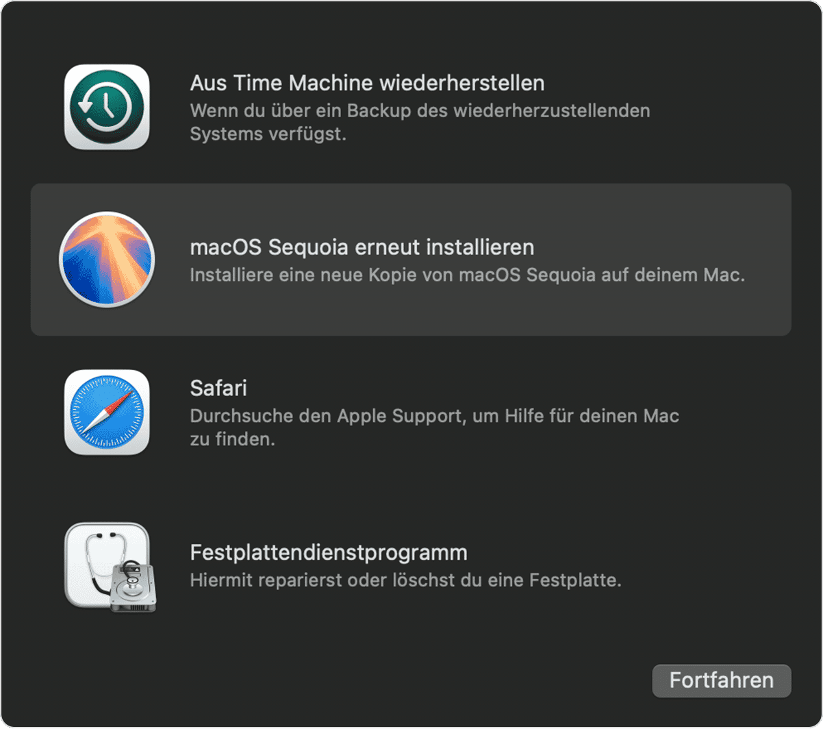 Sobald Sie sich im Wiederherstellungsmodus befinden, klicken Sie auf „macOS neu installieren” und folgen Sie den Anweisungen auf dem Bildschirm.