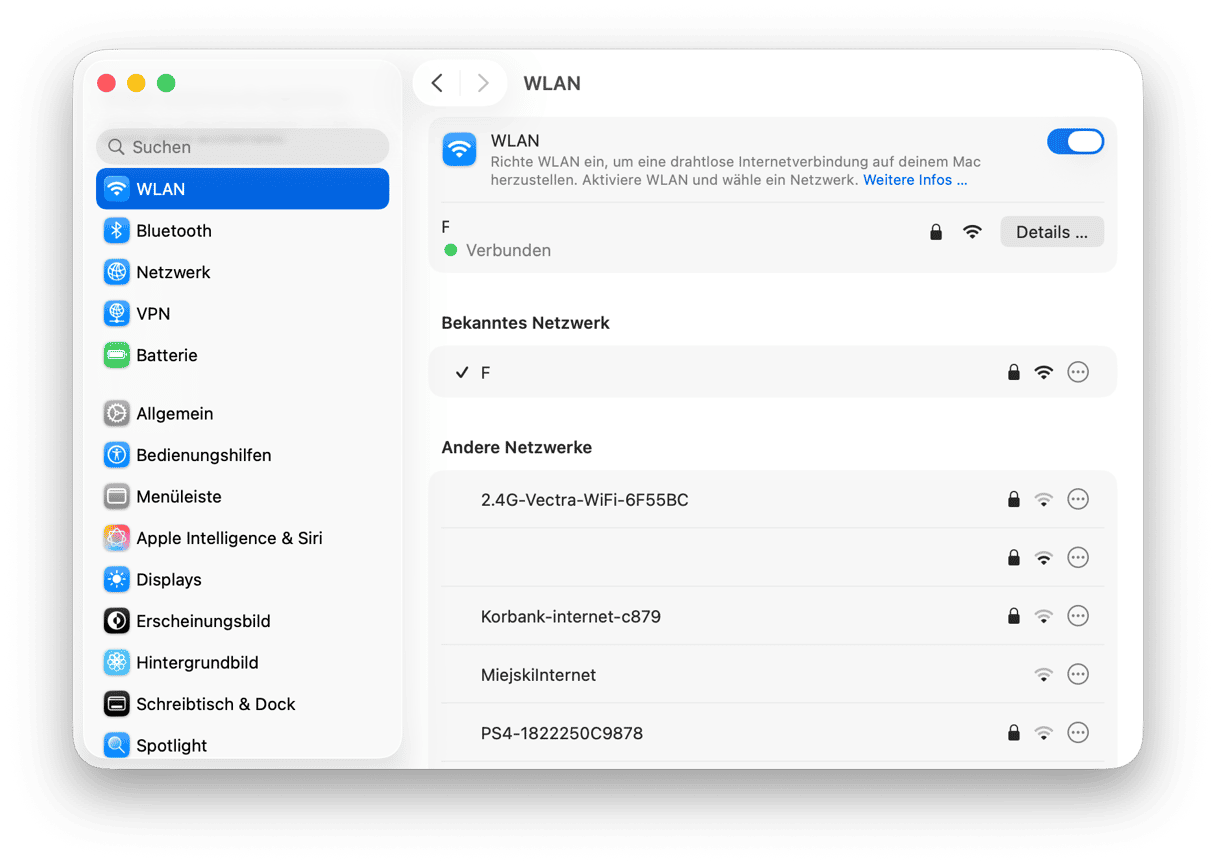 Wenn sich Ihr MacBook Air nicht mit dem WLAN verbinden lässt, andere Geräte aber schon, sollten Sie als Nächstes versuchen, das Netzwerk auf Ihrem Mac zu löschen. Auf diese Weise müssen Sie Ihr WLAN-Passwort erneut eingeben und die Verbindung wird vollständig erneuert. Klicken Sie auf das WLAN-Symbol in der Menüleiste und wählen Sie „WLAN-Einstellungen“ aus. Klicken Sie neben dem Netzwerknamen auf „Details“ und dann auf „Dieses Netzwerk ignorieren“. Klicken Sie nun erneut auf das WLAN-Symbol in der Menüleiste und klicken Sie auf den Dropdown-Pfeil neben „Andere Netzwerke“. Wählen Sie Ihr WLAN-Netzwerk aus und geben Sie Ihren Benutzernamen und Ihr Passwort ein. Genau wie andere Lösungen, die wir auflisten, funktioniert dieser Tipp bei allen Mac-Modellen.