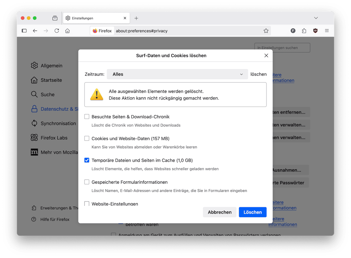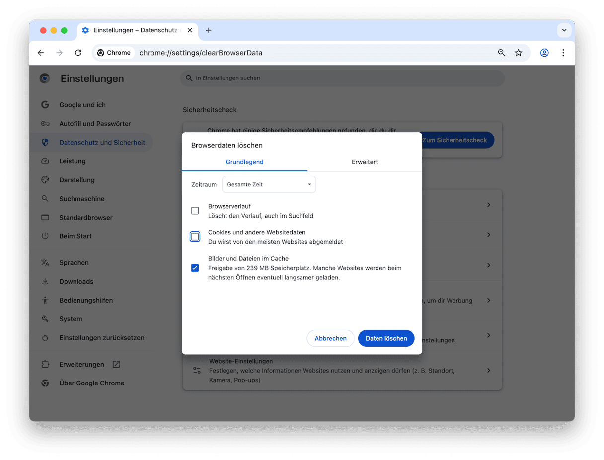 - Öffnen Sie die Systemeinstellungen > Datenschutz und Sicherheit > Browserdaten löschen.