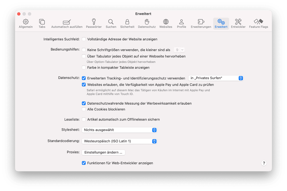 - Öffnen Sie den Tab „Erweitert“ und aktivieren Sie das Kontrollkästchen „Menü 'Entwickler' in der Menüleiste anzeigen“ (in macOS Sequoia: „Funktionen für Web-Entwickler anzeigen“).
