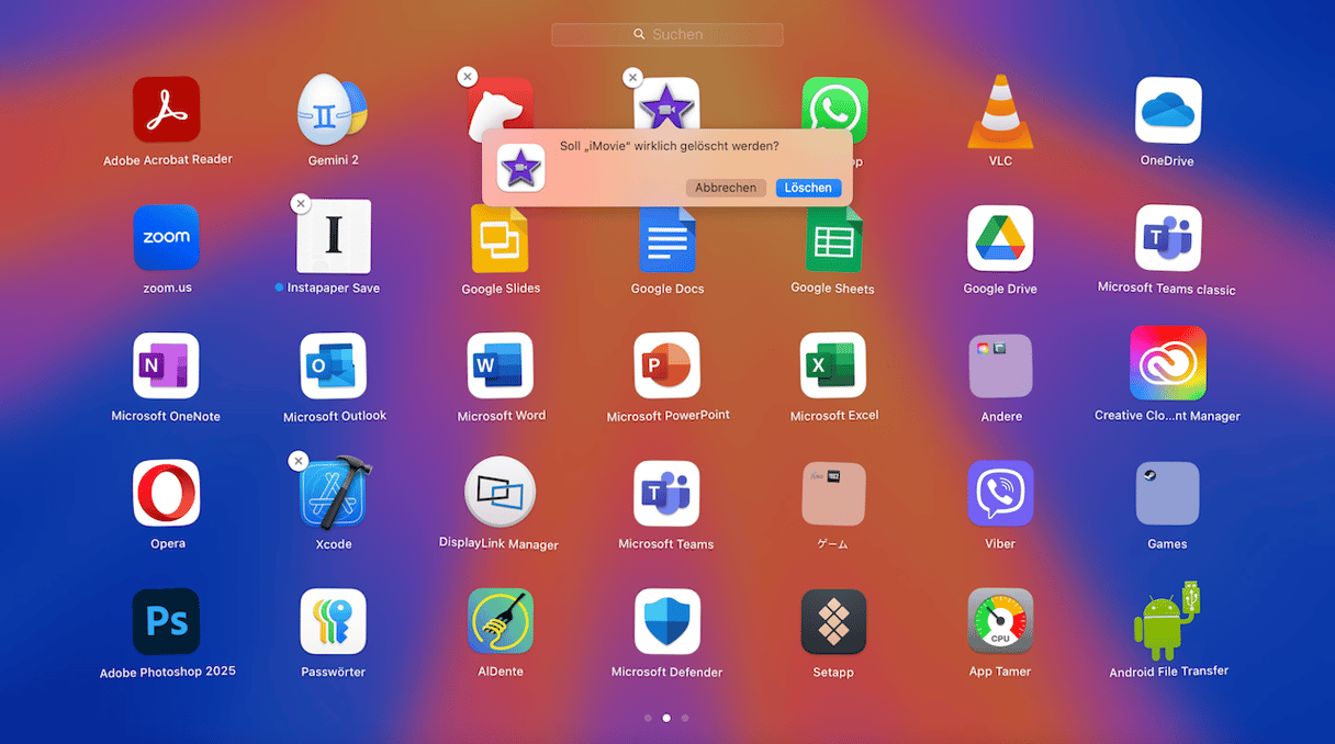 Wir löschen Programme am liebsten über Launchpad, da dies einfach am meisten Spaß macht. Klicken Sie im Dock auf Launchpad. Halten Sie die ctrl-Taste gedrückt und klicken Sie auf ein beliebiges App-Symbol, bis alle Symbole zu wackeln beginnen. Oben an den Symbolen wird [X] angezeigt – klicken Sie darauf, um die entsprechende App zu löschen.
