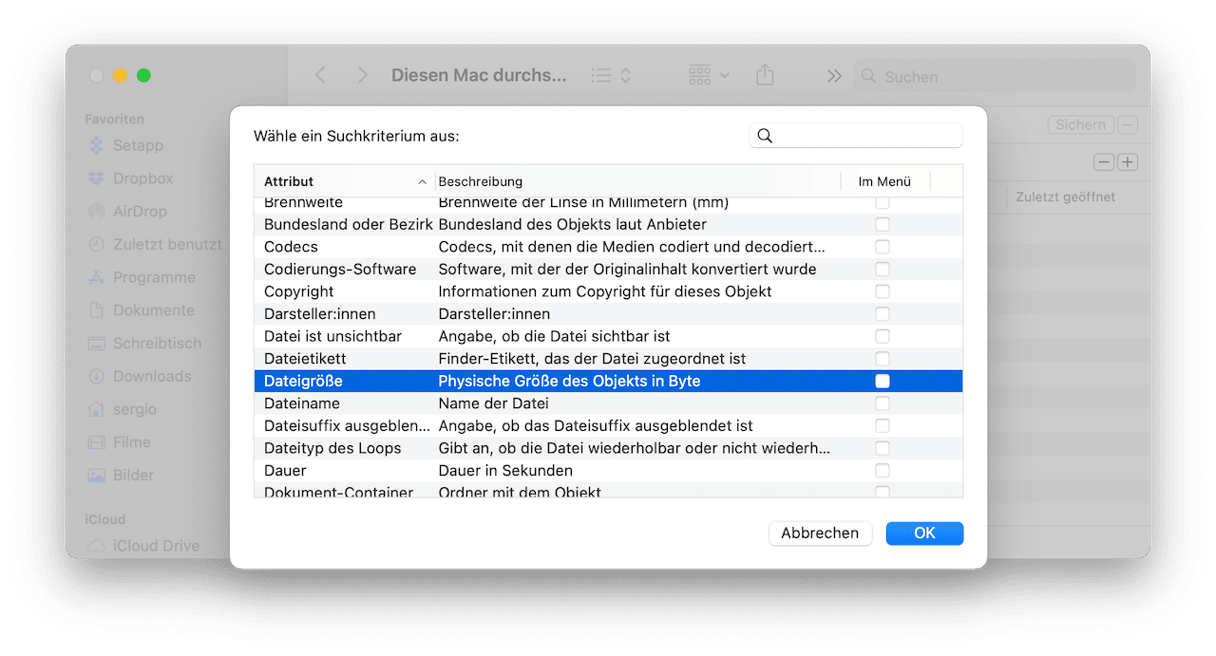 Sehr gut! Jetzt können Sie verschiedene Dateierweiterungen eingeben, indem Sie auf die Schaltfläche „+“ drücken, und die Ergebnisse nach Größe sortieren (Führen Sie die obigen Schritte erneut aus und wählen Sie dieses Mal die Option „Dateierweiterung“ aus der Liste „Andere...“). Wir empfehlen, dass Sie mit .DMG-Dateien oder den Installationsprogrammen beginnen. Wenn sie ihren Zweck erfüllt haben, sind sie nur noch Ballast, der ohne Bedenken abgeworfen werden kann. Das Gleiche gilt für .ZIP-Archive.