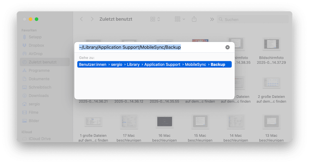 - Geben Sie ein: ~/Library/Application Support/MobileSync/Backup und drücken Sie die Eingabetaste.