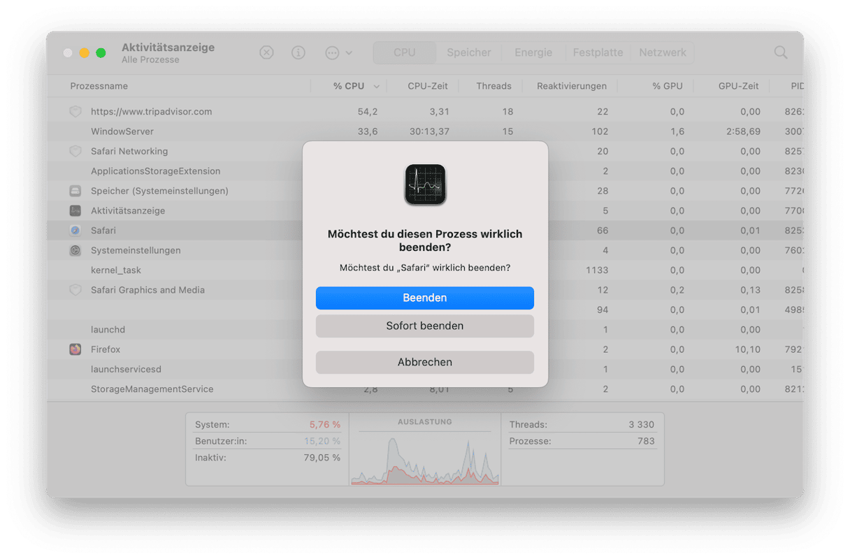 - Beenden Sie ressourcenintensive Apps (die zu viel Arbeitsspeicher und CPU beanspruchen) über die Aktivitätsanzeige. Wählen Sie dazu den Ressourcenfresser aus und klicken Sie in der Symbolleiste auf „X“ > „Beenden“.