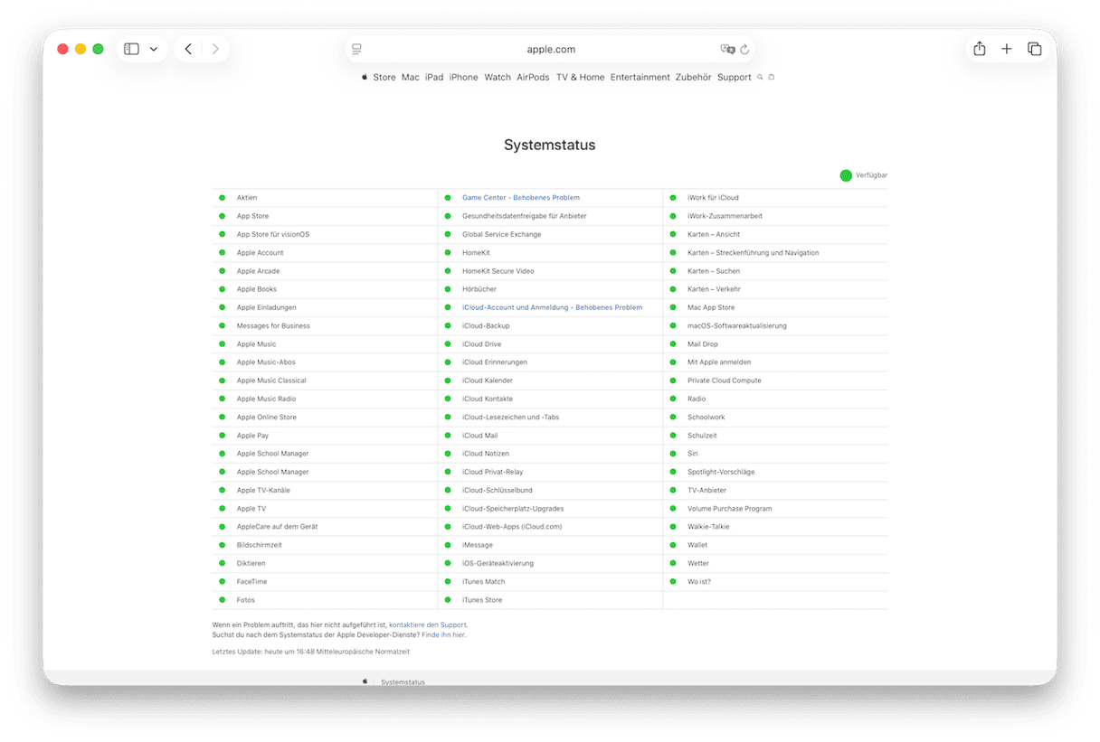 - Überprüfen Sie, ob die Server von Apple funktionieren. Besuchen Sie dazu die Statusseite von Apple und suchen Sie nach einem grünen Punkt neben „macOS Softwareupdate“.