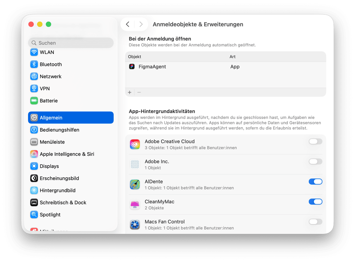 Um noch einen Schritt weiter zu gehen, können Sie mit dem Leistungs-Feature zusätzliche Wartungsaufgaben ausführen. Damit können Sie auch Anmeldeobjekte und Hintergrunderweiterungen verwalten sowie Time Machine-Schnappschüsse löschen.