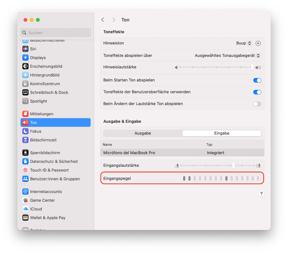 - Wenn Sie nun in der Nähe Ihres Mac sprechen, dann sollten sich die Balken des Eingangspegels füllen.