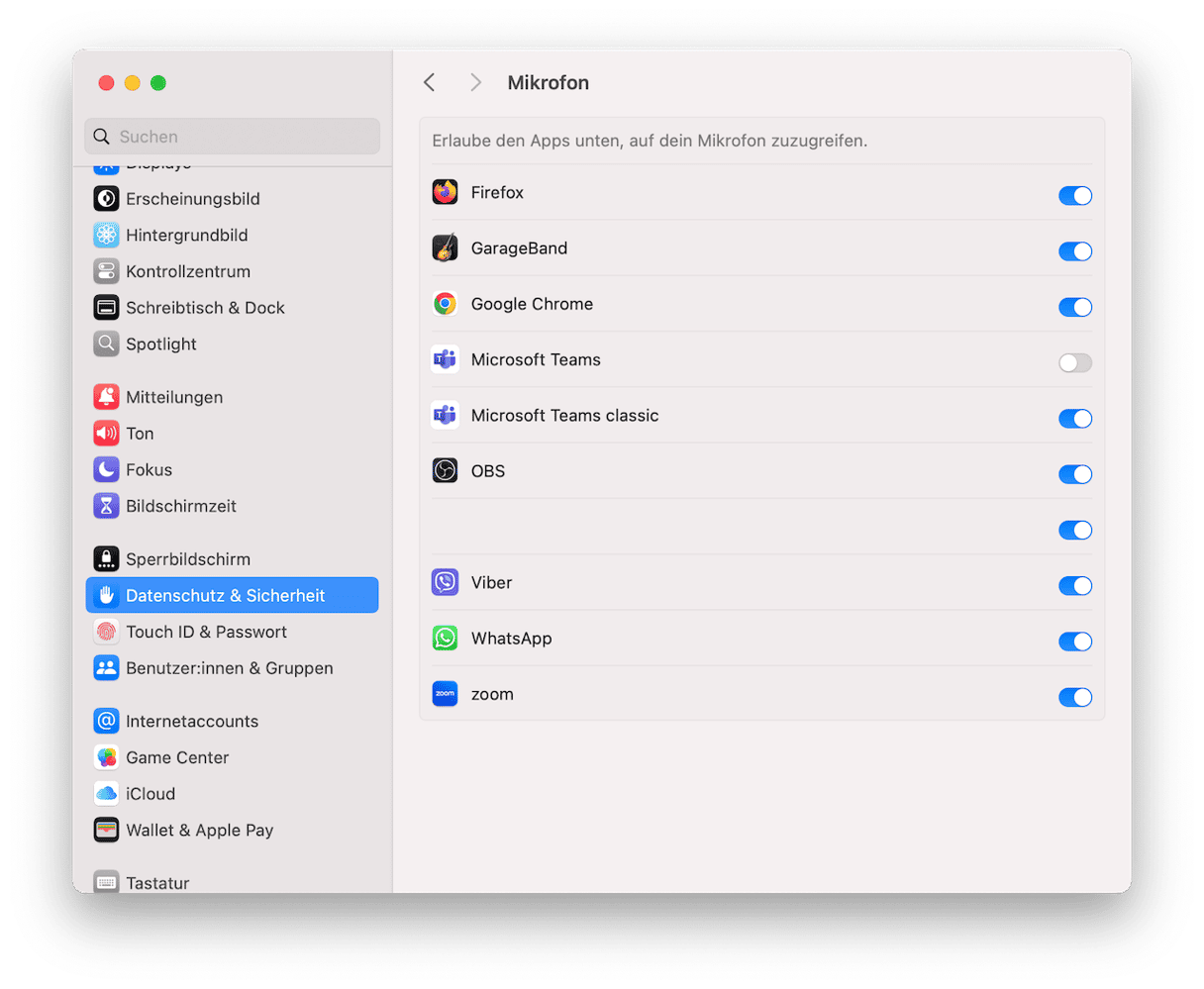 Wenn das Mikrofon plötzlich nicht mehr funktioniert, dann kann es sein, dass diese Zugriffsrechte aus irgendeinem Grund widerrufen wurden. Überprüfen Sie diese Einstellungen also noch einmal und gewähren Sie die Zugriffsrechte bei Bedarf erneut: Öffnen Sie die Systemeinstellungen und gehen Sie zu „Datenschutz und Sicherheit“. Klicken Sie dann auf „Mikrofon“.