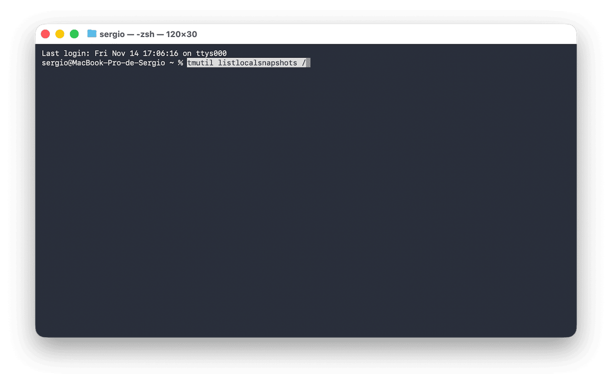 tmutil listlocalsnapshots / - Löschen Sie jeden einzelnen Schnappschuss mit: