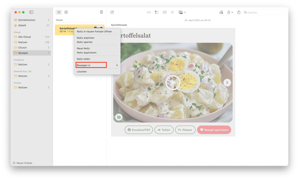 - Wählen Sie „Verschieben nach“ > „iCloud“ und dann einen Ordner, in den Sie die Notiz verschieben möchten.