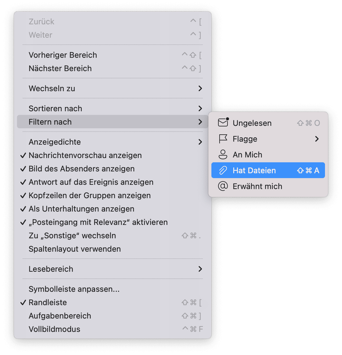 - Klicken Sie in der Menüleiste auf „Ansicht“ > „Filtern nach“ > „Enthält Anhänge“ – nun sollten in Ihrem Posteingang nur noch Nachrichten mit Anhängen angezeigt werden.