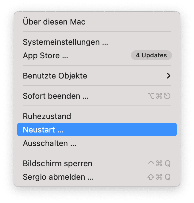 Um Ihren Mac neu zu starten, klicken Sie im Hauptmenü von Apple auf „Neustart“.