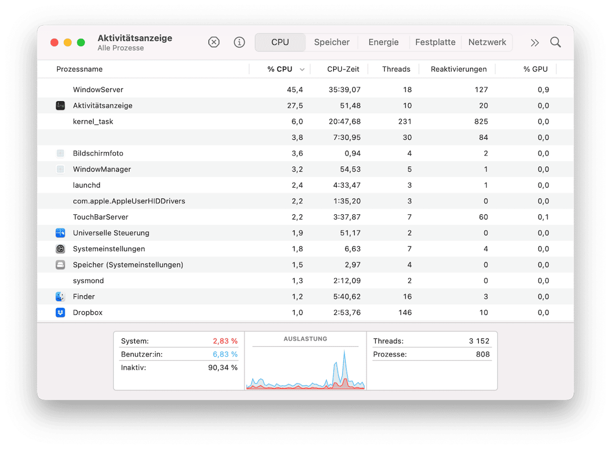 - Wenn Ihr Mac langsam ist, dann achten Sie besonders auf den Bereich „CPU“. Hier wird angezeigt, wie sich Prozesse auf die CPU (den Prozessor) auswirken. Intensive Apps wie Videobearbeitungsprogramme oder Spiele beanspruchen in der Regel mehr CPU-Kapazität. Diese Apps werden auf der Registerkarte CPU ganz oben in der Liste aufgeführt. Wenn eine App die CPU stark belastet, dann können Sie sie beenden: Markieren Sie die App oder den Prozess und klicken Sie auf das „X“ in der linken Ecke der Aktivitätsanzeige.