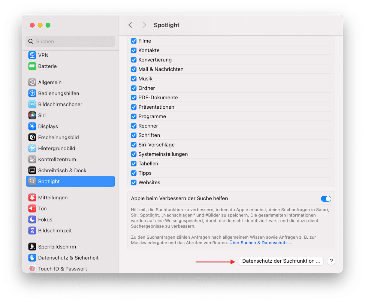 Wenn Sie das Betriebssystem kürzlich aktualisiert haben, dann ist Ihnen vielleicht aufgefallen, dass der Mac langsamer wird, während der Spotlight Index erstellt wird. Dies nimmt nur wenige Stunden in Anspruch und anschließend funktioniert der Mac wieder wie gewohnt. Aber manchmal bleibt die Indizierung hängen, sodass der Mac beschleunigt werden muss. Um dieses Problem zu lösen, müssen Sie Spotlight neu indizieren. Öffnen Sie hierfür die Systemeinstellungen > Siri & Spotlight und klicken Sie ganz unten auf „Spotlight-Datenschutz“.