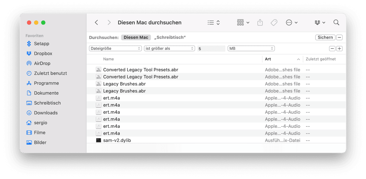 - In der nächsten Auswahlliste wählen Sie „ist größer als“ und legen den Wert fest (z. B. 5 MB). Alternativ können Sie die Dateien auch nach dem letzten Zugriffsdatum oder dem Dateityp sortieren.