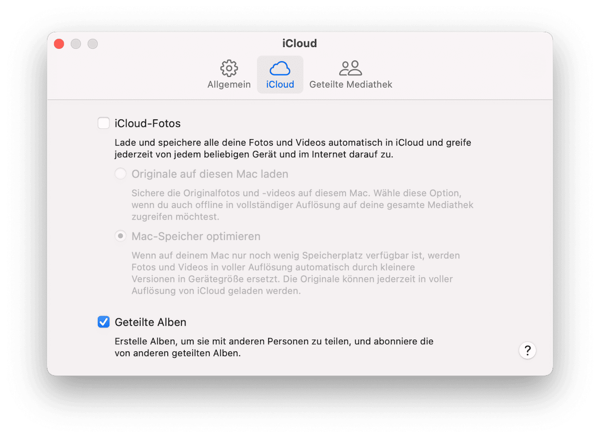 Wenn Sie das Kästchen iCloud-Fotos markieren, verbinden Sie Ihre Fotos-Bibliothek mit iCloud. Und was noch wichtiger ist: Wenn Sie „Mac-Speicher optimieren“ wählen, wird ein Teil Ihrer Fotomediathek in die iCloud verschoben. Auf diese Weise spart das macOS wertvollen Platz. Mit dem kostenlosen iCloud-Plan können Sie mindestens 5 GB Speicherplatz freigeben.