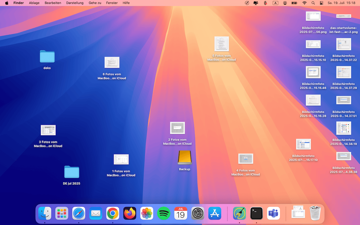 „Meinen Schreibtisch aufräumen... aber warum?“ Weil die Schreibtische von einigen Menschen nicht schön anzuschauen sind. Darum. Sortieren Sie Ihren Schreibtisch und werden Sie Dateien los, die Sie nicht mehr benötigen. Das sieht erstens besser aus und hilft zweitens Ihrem Mac, schneller zu arbeiten (ich kenne die technischen Gründe dahinter nicht, aber der Effekt ist einfach zu offensichtlich, um ihn zu leugnen). Ihr Mac verschwendet keine Zeit damit, all die Symbole zu laden, also ... bitte einfach aufräumen.
