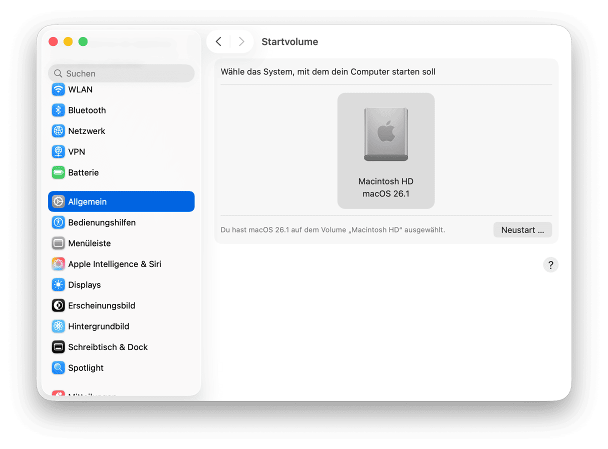 Ein Startvolume oder ein Startlaufwerk ist ein Volume oder eine Partition eines Laufwerks, das Ihr macOS und Ihre Programme enthält und zum Starten Ihres Mac verwendet wird. Standardmäßig ist dies „Macintosh HD“ (ein integriertes Laufwerk), Sie können jedoch in den Systemeinstellungen ein anderes Laufwerk auswählen.