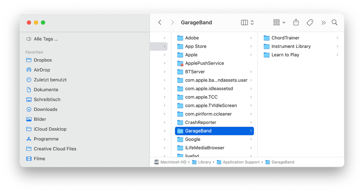 ~/Library/Containers (Ordner mit dem Namen GarageBand und mehrere Dateien und Ordner, die mit „com.apple.garageband“ beginnen)