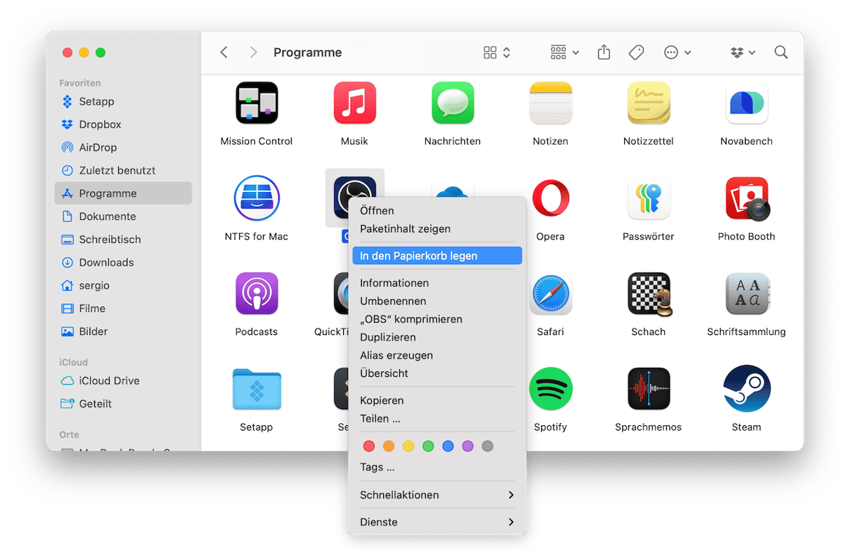 - Öffnen Sie den Ordner „Programme“ und ziehen Sie OBS Studio in den Papierkorb.