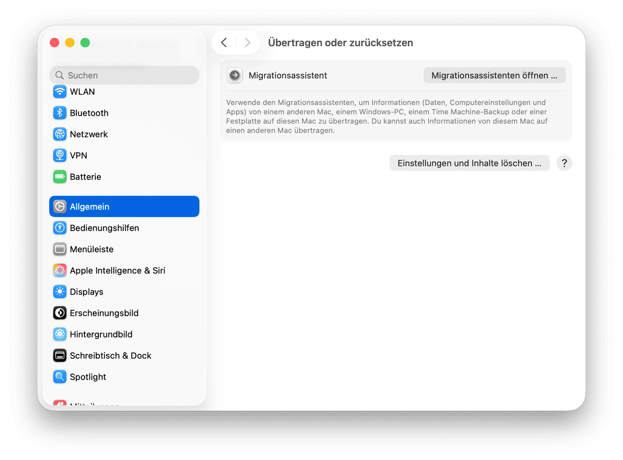 Sollten Sie keine Passphrase erhalten können, müssen Sie das „Übertragungs- oder Zurücksetzungsprogramm“ (Systemeinstellungen > Allgemein > Übertragen oder zurücksetzen > Einstellungen und Inhalte löschen) verwenden, um Ihren Mac zu löschen und neu zu starten. Denken Sie daran, zuvor alle erforderlichen Daten zu sichern.