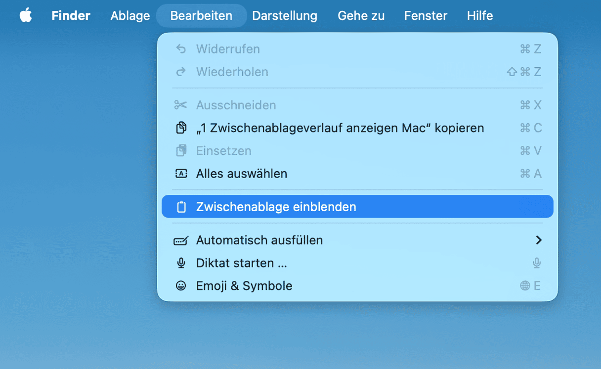 Wenn Sie die Zwischenablage anzeigen möchten, finden Sie sie über das Finder-Menü in der oberen Symbolleiste. Wählen Sie im Menü „Bearbeiten“ die Option „Zwischenablage einblenden“, um den zuletzt kopierten Eintrag anzuzeigen. Es wird nur der letzte Eintrag angezeigt. Wenn Sie einen neuen Inhalt kopieren, verschwindet der vorherige.