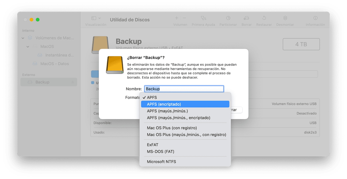 Para formatear una unidad externa, abre la Utilidad de Discos, selecciona tu unidad externa y haz clic en Borrar. Luego, selecciona tu sistema de archivos preferido (APFS, Mac OS Plus o exFAT) y sigue las instrucciones que se muestran en pantalla.