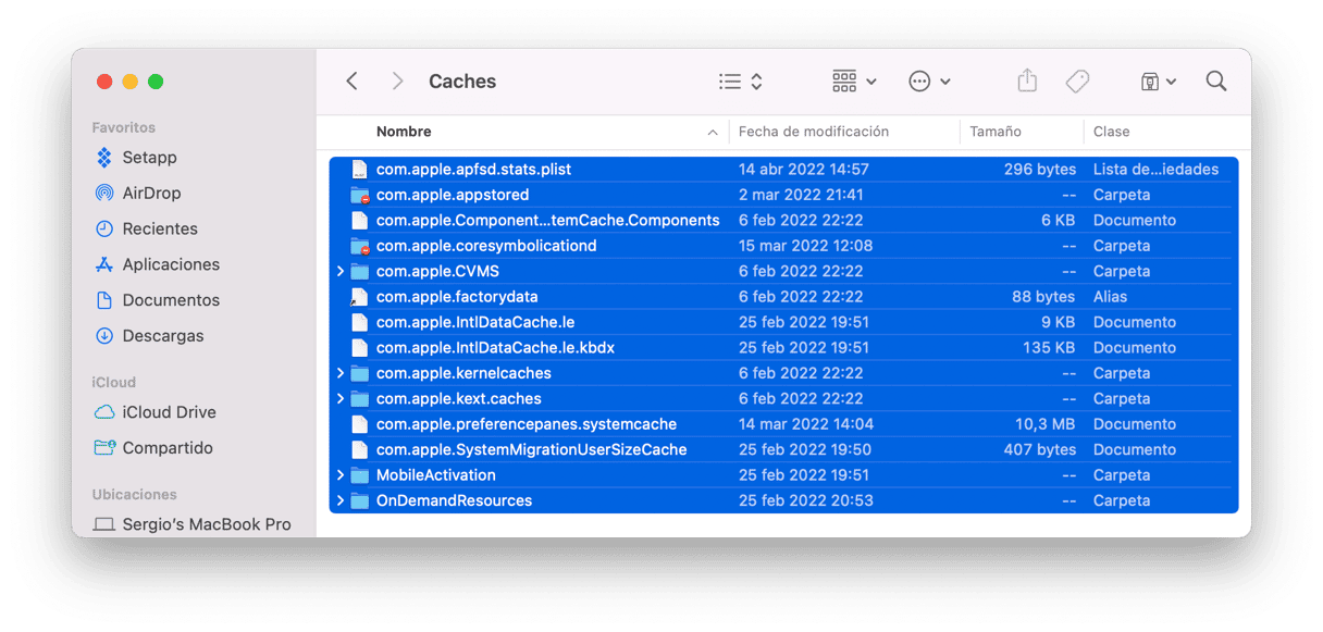 Para borrar la caché del sistema, revisa las carpetas com.apple que ves y envía los archivos que hay dentro a la Papelera. Es importante eliminar solo los archivos — no elimines las carpetas.