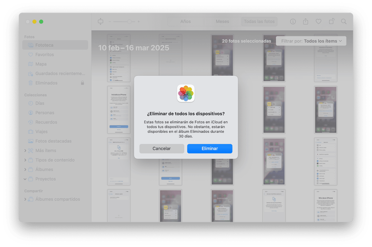 Ahora que has desactivado la sincronización, los cambios que hagas en la app Fotos en tu Mac no se sincronizarán con iCloud, por lo que puedes eliminar tus fotos de forma segura.