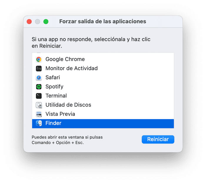 - Pulsa Opción + Comando + Escape para mostrar el menú Forzar salida.