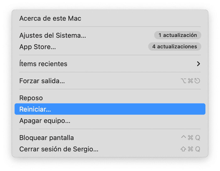 Reiniciar tu Mac puede borrar los archivos temporales, cachés y solucionar errores del sistema que pueden estar afectando los íconos del escritorio y el rendimiento general del sistema. Para hacerlo, haz clic en el menú Apple y selecciona Reiniciar. Cuando el ordenador reinicie, comprueba si el problema se ha resuelto.