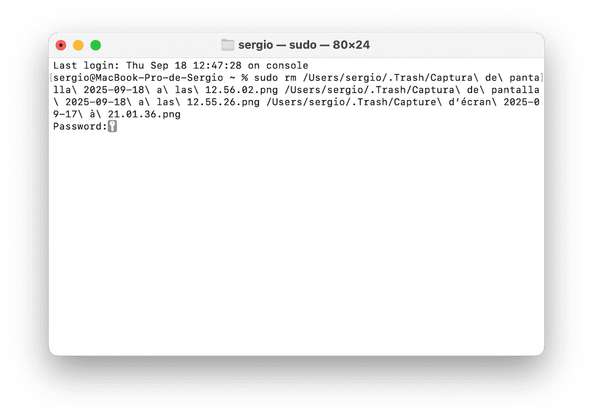 sudo rmseguido de un espacio y no presiones Intro todavía (es importante). - Ahora abre la Papelera en el Dock y arrastra y suelta los archivos que se encuentran dentro de la Papelera en la ventana de la Terminal.