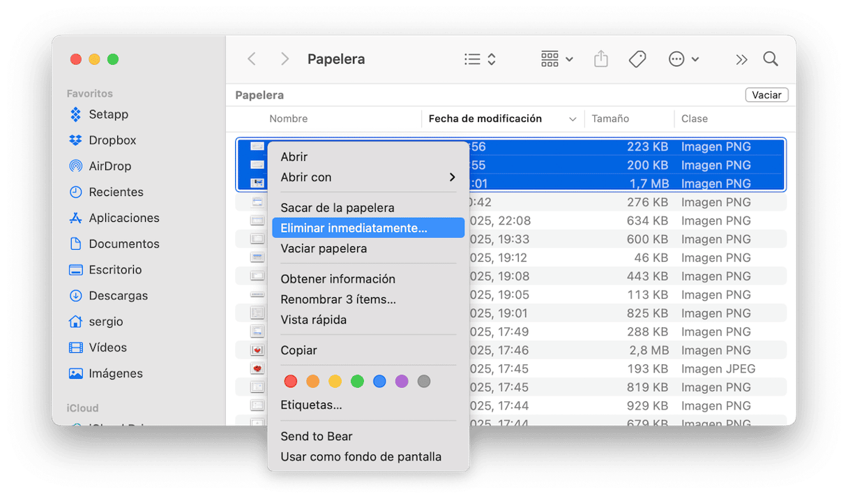 Atención: ¡no hay vueltas atrás! Usa Comando + Opción + Suprimir si quiere eliminar un archivo definitivamente. No pasará por la Papelera, por lo que no podrás restaurarlo más tarde.