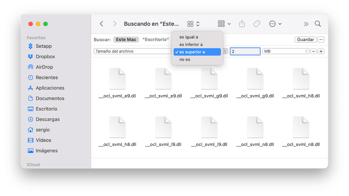 Recuerda seleccionar Este Mac para obtener una lista completa de resultados. Después, verás todos los archivos con un tamaño superior al que has definido. Revisa los documentos encontrados y elimina los archivos innecesarios que ocupan demasiado espacio en tu Mac.