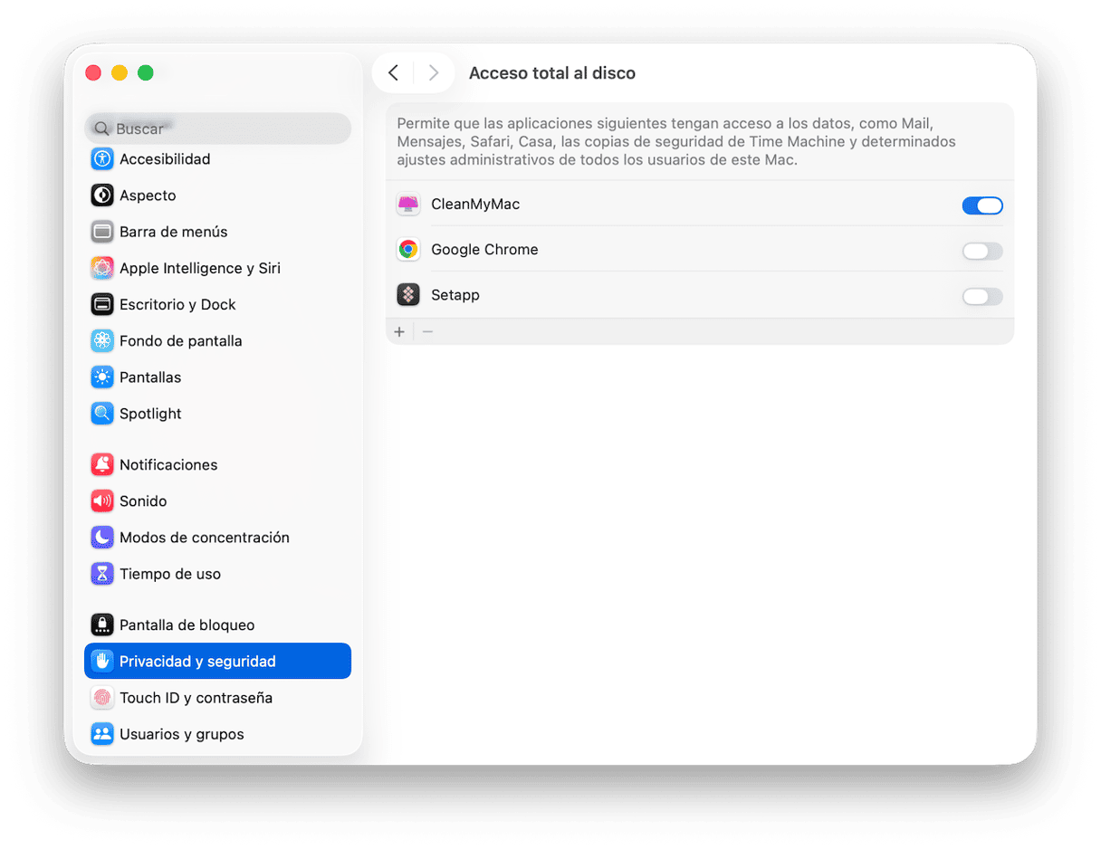 - Ve a Privacidad y seguridad > Acceso total al disco.